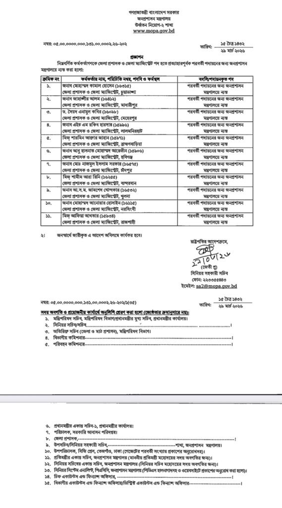 In a significant administrative move, the government has withdrawn the District Commissioners (DCs) of 11 districts across the country. The Ministry of Public Administration issued a formal notification on Sunday (March 29) regarding this reshuffle.